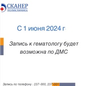 С 1 июня 2024 г. приём врача-гематолога будет возможен по полису ДМС.